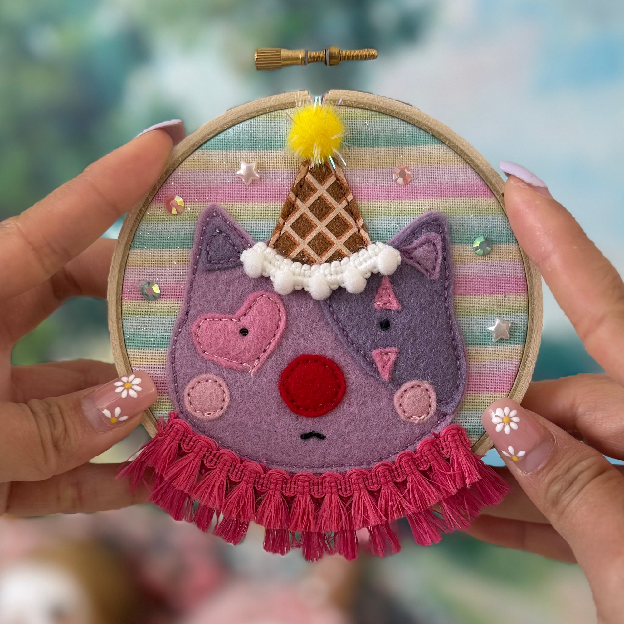 Adorned embroidery hoop with wool-blend felt, gems and fabric.